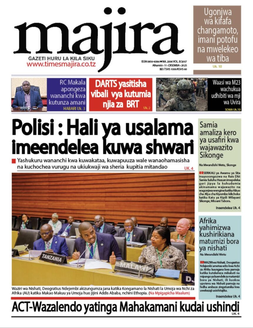 MagazetiHABARI KUBWA KATIKA MAGAZETI. YA LEO DEC 11 MWAKA 2025 NA ARUSHA24TV . Last updated: December 11, 2025 3:39 am Geofrey Stephen Share 0 Min Read Dec 11 Mwaka 2025 karibu Arusha24tv kutazama kilicho Andikwa katika Magazeti ya Tanzania mbele na nyuma Hii ni A24tv . Mwisho . SINTOFAHAMU KUHUSU POLEPOLE “KUTEKWA” ! MAGAZETI YA LEO OCT 7 MWAKA 2024 NA A24TV . BUTIKU ASEMA TAIFA LINAHITAJI UPONYAJI ! MAGAZETI YA LEO IJUMAA DEC 5 MWAKA 2025 NA ARUSHA25TV . KIGOGO WA POLISI WATOANA JASHO NA LISSU MAHAKAMANI MAGAZETI YA LEO OCT 9 MWAKA 2025 NA A24TV. HABARI KUBWA KATIKA MAGAZETI YA LEO JUMA MOSI YA OCT 4 MWAKA 2025 NA A24TV . MBIVU MBICHI MPINA KUWANIA URAIS KUJULIKANA LEO ! MAGAZETI YA LEO SEPT 2 MWAKA 2025 NA A24TVSign Up For Daily NewsletterBe keep up! Get the latest breaking news delivered straight to your inbox. Email address: Leave this field empty if you're human: By signing up, you agree to our Terms of Use and acknowledge the data practices in our Privacy Policy. You may unsubscribe at any time. Share This Article Facebook Whatsapp Whatsapp Telegram Copy Link Print Previous Article SHUGHULI ZA KIJAMII KUREJEA LEO KAMA KAWAIDA ! MAGAZETI YA LEO DEC 10 MWAKA 2025 NA ARUSHA24TV . Next Article KITUO CHA SHERIA NA HAKI ZA BINADAMU (LHRC) CHAFUNGUA KESI KUISHTAKI SERIKALI YA TANZANIA KWA KUFUNGA MTANDAO Leave a Comment Leave a Comment Leave a Reply Cancel replyYour email address will not be published. Required fields are marked *Comment *Name * Email * Website Save my name, email, and website in this browser for the next time I comment. Stay Connected235.3kFollowersLike69.1kFollowersFollow11.6kFollowersPin56.4kFollowersFollow136kSubscribersSubscribe4.4kFollowersFollow - Advertisement -Latest News CHADEMA YATOA TAMKO KUHUSU VURUGU ZA OCTOBA 29 ! MAGAZETI YA LEO DEC 12 MWAKA 2025 NA A24TV. Magazeti December 12, 2025 MBUNGE WA PERAMIHO AFARIKI DUNIA, SPIKA AZUNGUMZA KWA HUZUNI BREAK NEWS December 11, 2025 KITUO CHA SHERIA NA HAKI ZA BINADAMU (LHRC) CHAFUNGUA KESI KUISHTAKI SERIKALI YA TANZANIA KWA KUFUNGA MTANDAO BREAK NEWS December 11, 2025 SHUGHULI ZA KIJAMII KUREJEA LEO KAMA KAWAIDA ! MAGAZETI YA LEO DEC 10 MWAKA 2025 NA ARUSHA24TV . Magazeti December 10, 2025AdvertiseAdvertise with usNewslettersDeal